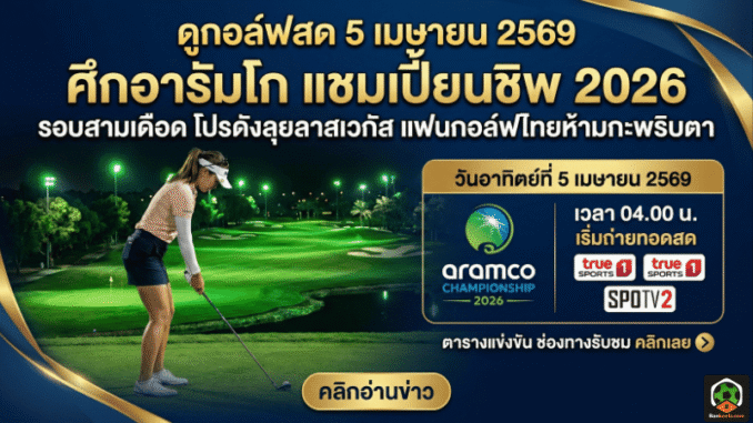ศึกอารัมโก แชมเปี้ยนชิพ 2026 รอบสาม ถ่ายทอดสดเช้าวันอาทิตย์ที่ 5 เมษายน 2569 เวลา 04.00 น. ทาง True Sports 1, SPOTV2 และติดตามช่องทางรับชมเพิ่มเติมผ่าน BANKEELA ได้ตลอด ใครไม่อยากพลาดโปรแกรม ดูกอล์ฟสดวันนี้ และอัปเดตผลการแข่งขันแบบใกล้ชิด อย่าลืมตามเช็กทุกความเคลื่อนไหวได้ที่ กอล์ฟสดบ้านกีฬา