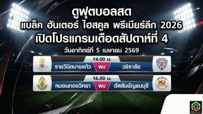 ศึก ฟุตบอลนักเรียน แบล็ค ฮันเตอร์ ไฮสคูล พรีเมียร์ลีก 2026 สัปดาห์ที่ 4 วันอาทิตย์ที่ 5 เมษายน 2569 มีคิวดวล 2 คู่สำคัญ เริ่มจาก ราชวินิตบางแก้ว พบ วชิราลัย เวลา 14.00 น. ต่อด้วย หมอนทองวิทยา พบ อัสสัมชัญธนบุรี เวลา 16.00 น. ถ่ายทอดสดผ่าน TrueVisions NOW และรับชมผ่าน BANKEELA ได้เช่นกัน