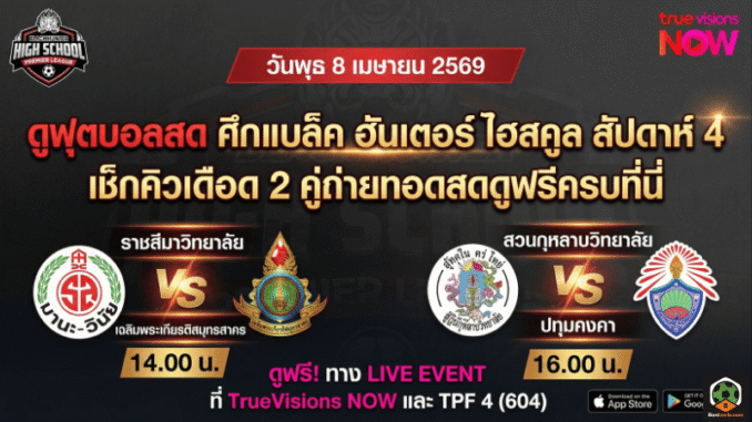 ศึก ฟุตบอลนักเรียน ในรายการ Black Hunter High School Premier League 2026 สัปดาห์ที่ 4 เดินหน้าต่อในวันพุธที่ 8 เมษายน 2569 กับโปรแกรม 2 คู่ที่แฟนบอลเยาวชนไม่ควรพลาด ใครกำลังมองหาคิว ดูฟุตบอลสดวันนี้ มีให้ตามเชียร์ต่อเนื่องตั้งแต่บ่ายถึงเย็น