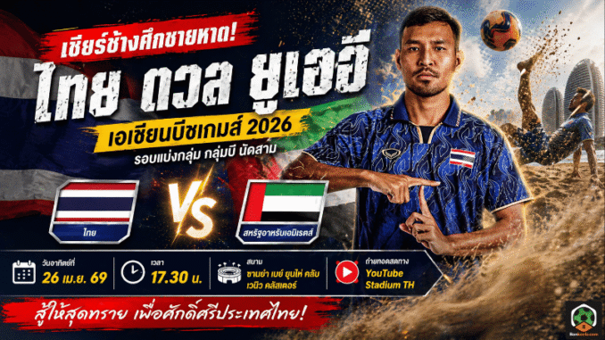 ถึงเวลารวมพลังเชียร์ ฟุตบอลชายหาดทีมชาติไทย ลงสนามนัดที่สามของรอบแบ่งกลุ่ม กลุ่มบี ในศึก เอเชียนบีชเกมส์ 2026 ที่เมืองซานย่า ประเทศจีน โดยเกมนี้ทัพช้างศึกชายหาดต้องเจอกับ สหรัฐอาหรับเอมิเรตส์ หรือ ยูเออี คู่แข่งที่ขึ้นชื่อเรื่องเกมรุกดุดันและจังหวะเข้าทำเฉียบคม