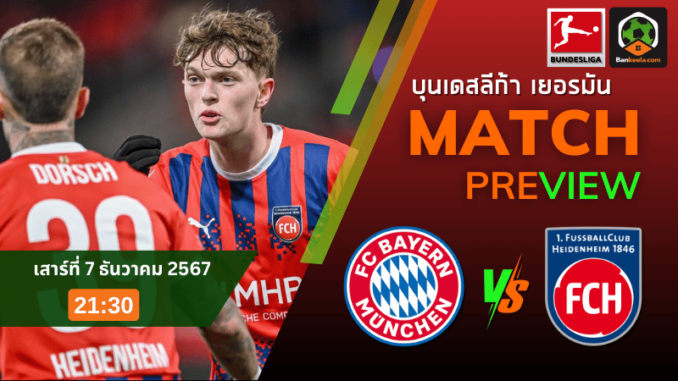 ศึกใหญ่แห่งบุนเดสลีกากำลังจะเริ่มขึ้น การแข่งขันครั้งนี้สำคัญยิ่งสำหรับทั้งสองทีม โดยฝั่งเจ้าบ้าน “บาเยิร์น มิวนิค” ต้องการสามแต้มเพื่อรักษาจ่าฝูง ขณะที่ “ไฮเด้นไฮม์” ทีมจากโซนท้ายตารางต้องดิ้นรนเพื่อหนีตกชั้น เกมนี้ถูกบรรจุใน ตารางบอลวันนี้ ที่แฟนบอลทุกคนไม่ควรพลาด