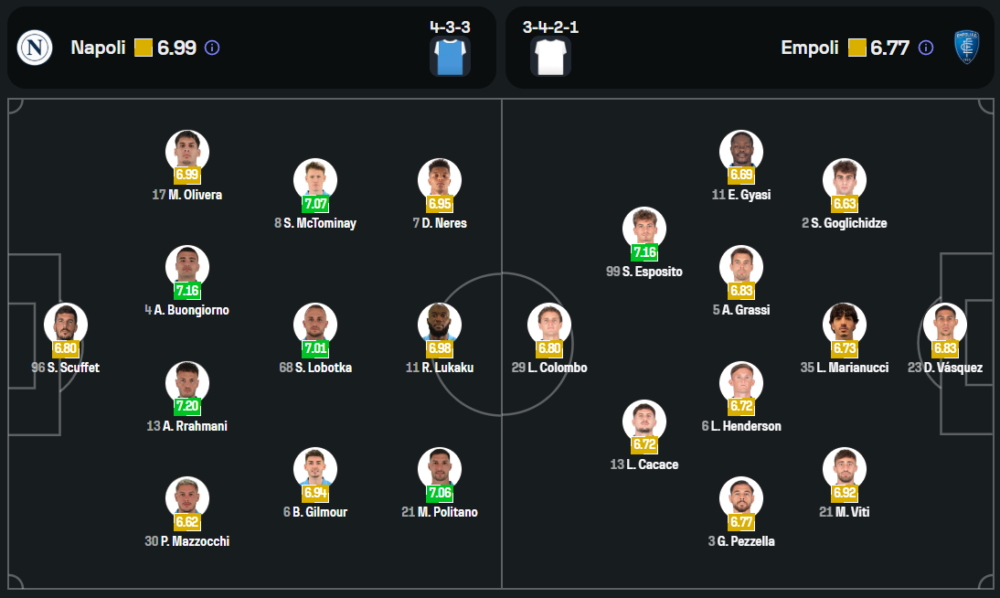 นาโปลี ของอันโตนิโอ คอนเต้ ยังรักษาความแน่นอนในระบบการเล่น แม้เกมรุกจะดูฝืดลงช่วงหลัง เกมนี้พวกเขาจะไม่มี โจวานนี่ ดิ ลอเรนโซ่ และฟร้องค์ อองกิสซ่า ที่ติดโทษแบนทั้งคู่ ส่งผลให้แผงหลังและมิดฟิลด์ต้องปรับเล็กน้อย โดย ปาสกวาเล่ มาซซ็อคคี่ และ บิลลี่ กิลมัวร์ จะได้ออกสตาร์ท ด้านแดนหน้า โรเมลู ลูกากู ยังคงนำทัพล่าประตูร่วมกับ มัตเตโอ โปลิตาโน่ และ ดาวิด เนเรส ที่เริ่มคืนฟอร์ม