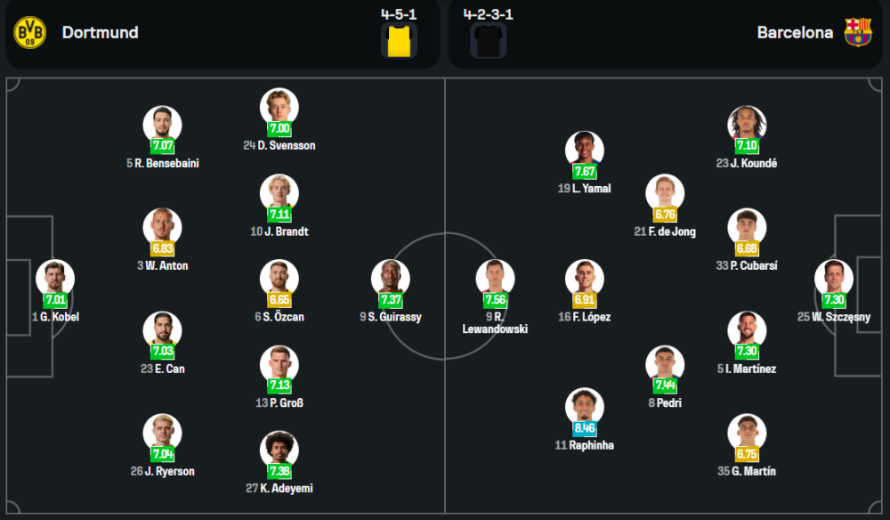 ทางฝั่ง บาร์เซโลน่า ของกุนซือ ฮันส์-ดีเตอร์ ฟลิค ยังคงไม่มี มาร์ค-อังเดร แทร์ สเตเก้น นายทวารมือหนึ่ง รวมถึงแบ็คซ้ายตัวเก่ง อเลฆานโดร บัลเด้ ที่เจ็บจากเกมลีก ส่งผลให้ เกร์ราด มาร์ติน ได้โอกาสยืนแบ็คซ้าย ส่วนแดนกลางและแดนหน้าไม่มีปัญหาใด ๆ โดยสามตัวรุกใช้ ราฟินญ่า, ลามีน ยามาล และ เฟร์มิน โลเปซ คอยสนับสนุน โรเบิร์ต เลวานดอฟสกี้ หอกตัวเก่งที่ยังร้อนแรงต่อเนื่อง ขณะที่คู่เซ็นเตอร์เลือกใช้ เปา คูบาร์ซี่ และ โรนัลด์ อาเราโฆ่ ที่มีฟอร์มการเล่นค่อนข้างนิ่ง