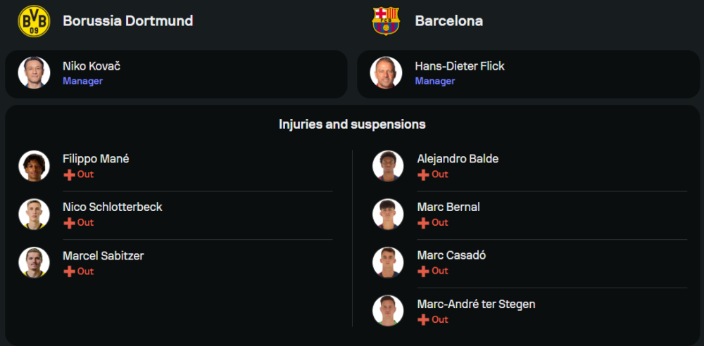 ฝั่งเจ้าถิ่น โบรุสเซีย ดอร์ทมุนด์ ภายใต้การคุมทัพของ นิโก้ โควัช สภาพทีมถือว่าไม่สมบูรณ์นัก พวกเขาจะยังไม่มี ฟิลิปโป้ มาเน่, นิโก้ ชลอตเตอร์เบ็ค และ มาร์เซล ซาบิตเซอร์ สามกำลังหลักที่มีอาการบาดเจ็บ ขณะเดียวกันก็มีการปรับแท็กติกจากเลกแรกมาเป็นระบบ 4-5-1 โดยวาง เชห์รู กีราสซี่ ที่ซัดไปแล้ว 25 ประตูในทุกรายการ ยืนหน้าเป้าล่าตาข่าย ส่วนเกมริมเส้นใช้ คาริม อเดเยมี่ กับ ดาเนียล สเวนส์สัน คอยเติมความเร็ว ขณะที่แผงมิดฟิลด์จะมี จูเลี่ยน บรันด์ ที่เล่นได้เนียนและคอยคุมจังหวะเกมร่วมกับ ปาสกาล โกร้สส์ และ เอ็มเร่ ชาน