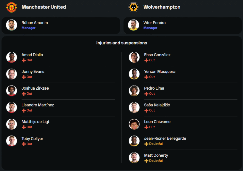 ลูกทีมของ รูเบน อาโมริม เพิ่งผ่านเกมหนักระดับมหากาพย์กับ ลียง ในศึกยูฟ่า ยูโรป้า ลีก ที่ลากยาวถึงช่วงต่อเวลา 120 นาที ก่อนจะเฉือนชนะมาได้อย่างหวุดหวิด 5-4 ส่งผลให้ขุนพล “ปีศาจแดง” อ่อนล้าพอตัว ความพร้อมเกมนี้ขาดนักเตะสำคัญเพียบ ไล่ตั้งแต่ ลิซานโดร มาร์ติเนซ, มัตไธย์ส เด ลิกต์, โจชัว เซิร์คซี และ อาหมัด ดิยัลโล่ ที่ยังเดี้ยงยกเซ็ต คาดว่าอาโมริมจะยังคงยึดหมาก 3-4-2-1 มี ราสมุส ฮอยลุนด์ เป็นตัวทีเด็ดจบสกอร์ โดยมี บรูโน่ แฟร์นานเดส และ อเลฮานโดร การ์นาโช่ หนุนหลัง