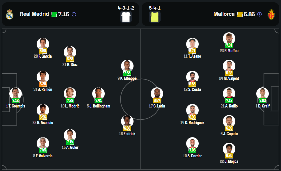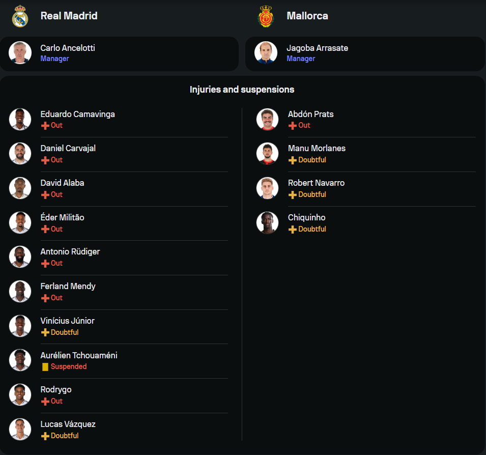 ภายใต้การนำทัพของ คาร์โล อันเชล็อตติ เกมนี้ปวดหัวหนักแน่นอน เพราะผู้เล่นตัวหลักพากันเจ็บเป็นแถบ ไล่ตั้งแต่แผงหลังอย่าง อันโตนิโอ รูดิเกอร์, เอแดร์ มิลิเตา, ดานี่ การ์บาฆาล, ดาบิด อลาบา ไปจนถึงแผงกลางอย่าง เอดูอาร์โด้ คามาวิงก้า และตัวริมเส้นอย่าง แฟร์กล็อง เมนดี้ ยังรวมถึง โรดรีโก้ และ วินิซิอุส จูเนียร์ ที่ยังต้องลุ้นความฟิต ขณะที่ ออเรเลียง ชูอาเมนี่ ก็ติดโทษแบนอีกราย แน่นอนว่าแม้ขุมกำลังจะดูบอบช้ำ แต่การได้ เอ็มบัปเป้ ที่ฟอร์มร้อนแรงจัดกดแฮตทริกมาในนัดล่าสุด ยังพร้อมเป็นหัวหอกล่าสกอร์เคียงข้าง เบลลิงแฮม และ อาร์ด้า กูเลอร์ ที่ได้โอกาสลงมาสร้างเกมมากขึ้นเรื่อยๆ