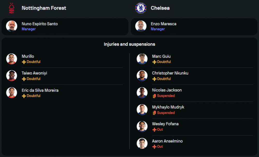 ฝั่ง “สิงห์บลูส์” ของ เอ็นโซ่ มาเรสก้า เพิ่งปลดล็อกความกดดันด้วยชัยชนะเหนือแมนฯ ยูไนเต็ด 1-0 แต่เกมนี้มีปัญหาหลายจุดทั้งนักเตะติดโทษแบนและบาดเจ็บ นิโคลัส แจ็คสัน กับ มีไคโล มูดริค โดนแบนควงกัน ส่วน เวสลี่ย์ โฟฟาน่า และ อารอน อันเซลมิโน่ ยังเดี้ยงยาว ด้านผู้เล่นที่เหลือจะมาในระบบ 4-2-3-1 เช่นกัน หวังพึ่งความสร้างสรรค์ของ โคล พัลเมอร์ และการเติมเกมจากขอบเส้นอย่าง โนนี่ มาดูเอเก้ กับ เปโดร เนโต้