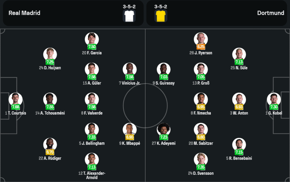 ฝั่งเสือเหลืองของ นิโก้ โควัช ก็สภาพไม่สมบูรณ์เต็มร้อยเช่นกัน เพราะจะขาด โจ๊บ เบลลิ่งแฮม ที่ติดโทษแบน แถมยังมี ซาลิห์ ออซชาน, เอ็มเร่ ชาน และ นิโค่ ชลอตเตอร์เบ็ค เดี้ยงยาว แถม คาเนย์ ชุควูเอเมก้า ยังต้องรอทดสอบความฟิต อย่างไรก็ดีแนวรุกยังฝากความหวังได้กับ เชห์รู กีราสซี่ ที่ฟอร์มกำลังร้อนแรง จับคู่กับ คาริม อเดเยมี่ และ ยูเลี่ยน บรันด์ ในระบบ 3-4-3
