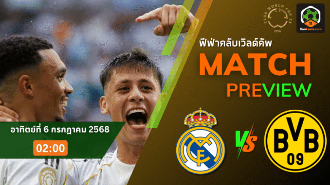 บรรยากาศค่ำคืนฟีฟ่าคลับเวิลด์คัพกลับมาระอุอีกครั้ง เมื่อ เรอัล มาดริด ยอดทีมจากสเปน เตรียมดวลเดือดกับ โบรุสเซีย ดอร์ทมุนด์ ตัวแทนจากเยอรมนี ในรอบก่อนรองชนะเลิศ คืนวันอาทิตย์ที่ 6 กรกฎาคม 2568 เวลา 02:00 น. ณ สนาม เม็ทไลฟ์ สเตเดี้ยม ราคาบอลเปิดมาให้ราชันต่อ 0.75+10 ถือว่าเป็นราคาที่แฟนบอลข้างมาดริดใจชื้นอยู่ไม่น้อย เพราะฟอร์มกำลังแรงจัด สำหรับใครที่กำลังเล็งเช็ค ตารางบอลวันนี้ นี่คือแมตช์ที่คุณไม่ควรพลาดด้วยประการทั้งปวง เพราะศักดิ์ศรีและตั๋วลุ้นแชมป์โลกเดิมพันอยู่ตรงหน้า