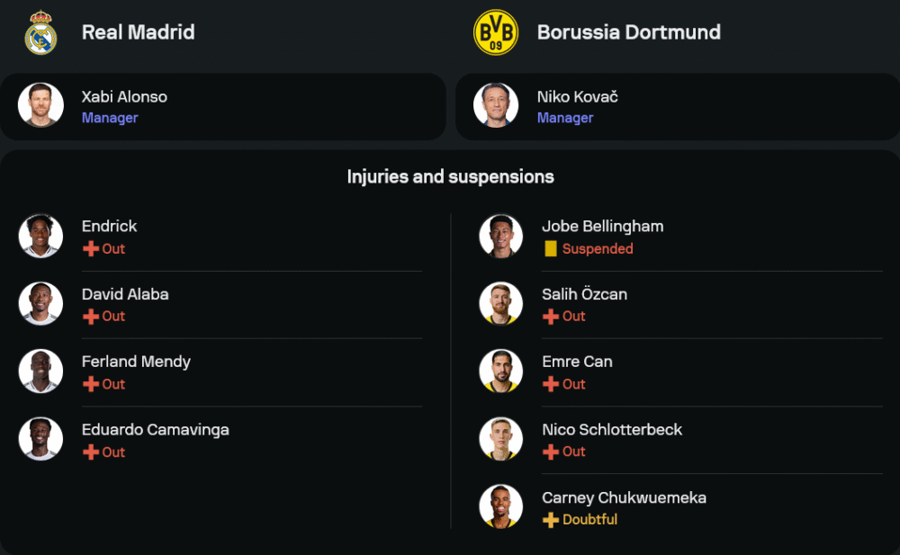 กุนซือ ชาบี อลอนโซ่ ยังต้องขาดขุมกำลังตัวหลักหลายรายทั้ง เอ็นดริค, ดาวิด อลาบา, แฟร์กล็องด์ เมนดี้ และ เอดูอาร์โด้ คามาวิงก้า ที่เจ็บกันยกแพ็ค แต่ก็มีข่าวดีเล็กๆ เมื่อ คิลิยัน เอ็มบัปเป้ มีชื่ออยู่ในทีมและลุ้นเรียกความฟิตในเกมสำคัญคืนนี้ คาดว่าจะจัดทัพด้วยระบบ 3-5-2 วาง วินิซิอุส จูเนียร์ กับ กอนซาโล่ การ์เซีย ล่าตาข่าย ขณะที่แดนกลางยังคงไว้ใจ จู๊ด เบลลิ่งแฮม บัญชาเกม