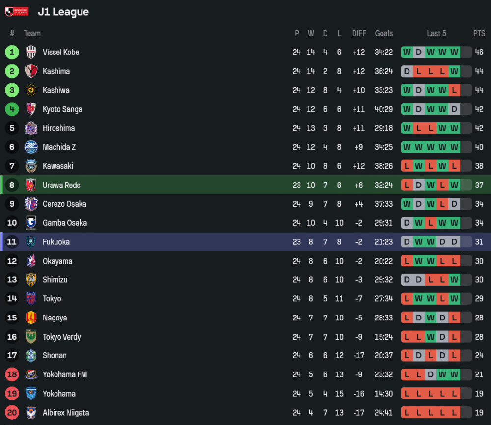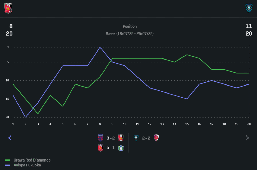 อวิสปา ฟูกูโอกะ: ฟอร์มโดยรวมเหนียวแน่น แพ้ไม่เป็นมา 6 นัดติดต่อกัน ชนะ 3 เสมอ 3 โดยเฉพาะสองเกมหลังในลีกจบที่ผลเสมอ พวกเขาเน้นรับแน่นและรอโต้กลับอย่างมีวินัย แต่เกมเยือนยังคงเป็นปัญหาใหญ่ ชนะเพียง 3 จาก 9 นัดเยือนหลังสุด และแพ้ถึง 6 จาก 8 เกมเยือนล่าสุด ฟอร์มโดยรวมคือแน่นแต่จบไม่คม โดยเฉพาะเมื่อลงสนามนอกบ้าน