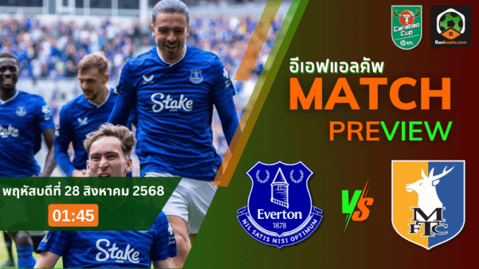 ศึกฟุตบอลถ้วย อีเอฟแอลคัพ รอบแรกค่ำคืนวันพฤหัสบดีที่ 28 สิงหาคม 2568 เวลา 01:45 น. ที่สนาม ฮิลล์ ดิ๊กคินสัน สเตเดี้ยม เจ้าถิ่น เอฟเวอร์ตัน ทีมดังจากพรีเมียร์ลีก เตรียมเปิดบ้านรับการมาเยือนของ แมนส์ฟิลด์ ทาวน์ สโมสรจากลีก วัน อังกฤษ เกมนี้ความแตกต่างของระดับชั้นลีกถูกสะท้อนผ่านเรตราคาบอลที่เปิดมา เอฟเวอร์ตัน ต่อ 1.75 แต่ถึงอย่างนั้นบรรยากาศการแข่งขันฟุตบอลถ้วยไม่เคยมีคำว่าง่าย โดยเฉพาะการวัดศักดิ์ศรีที่มักเกิดเซอร์ไพรส์ได้เสมอ สำหรับใครที่กำลังเช็ก ตารางบอลวันนี้ ต้องบอกเลยว่านี่คือคู่ที่ไม่ควรพลาด