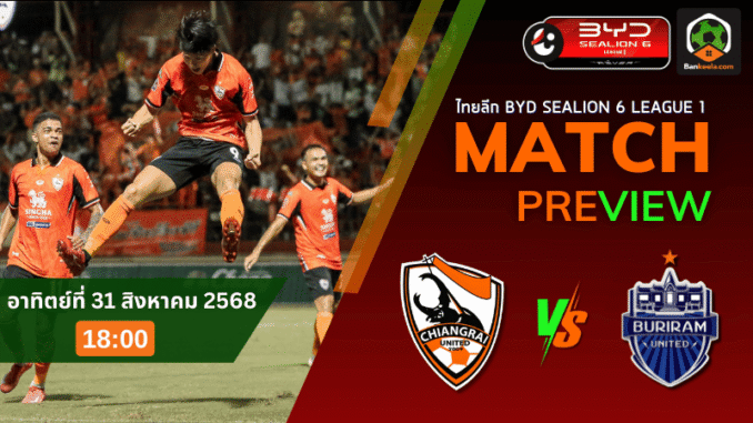 ศึกใหญ่แห่ง ไทยลีก BYD sealion 6 league 1 เดือดระอุในวันอาทิตย์ที่ 31 สิงหาคม 2568 เวลา 18:00 น. แฟนบอลทั่วประเทศต่างจับตามองเมื่อ เชียงราย ยูไนเต็ด เปิดรังเหย้า “ยูไนเต็ด สเตเดียม” รับการมาเยือนของ บุรีรัมย์ ยูไนเต็ด ทีมจ่าฝูงสุดแข็งแกร่ง ความมันส์พุ่งทะยานตั้งแต่ราคาต่อรองที่บ่อนยกให้ทีมเยือน บุรีรัมย์ฯ ต่อ 1 ลูกครึ่ง ทำให้เกมนี้ถูกขีดเส้นใต้ใน ตารางบอลวันนี้ ว่าเป็นคู่บิ๊กแมตช์ที่ทุกคนต้องห้ามพลาด เพราะมีทั้งศักดิ์ศรี คะแนน และความกดดันของสองทีมใหญ่เป็นเดิมพัน