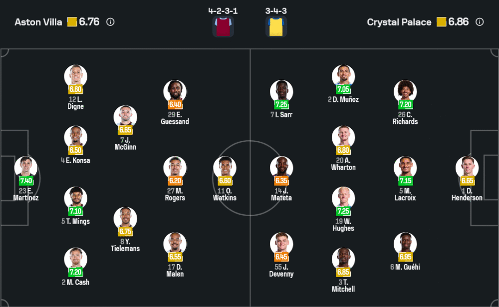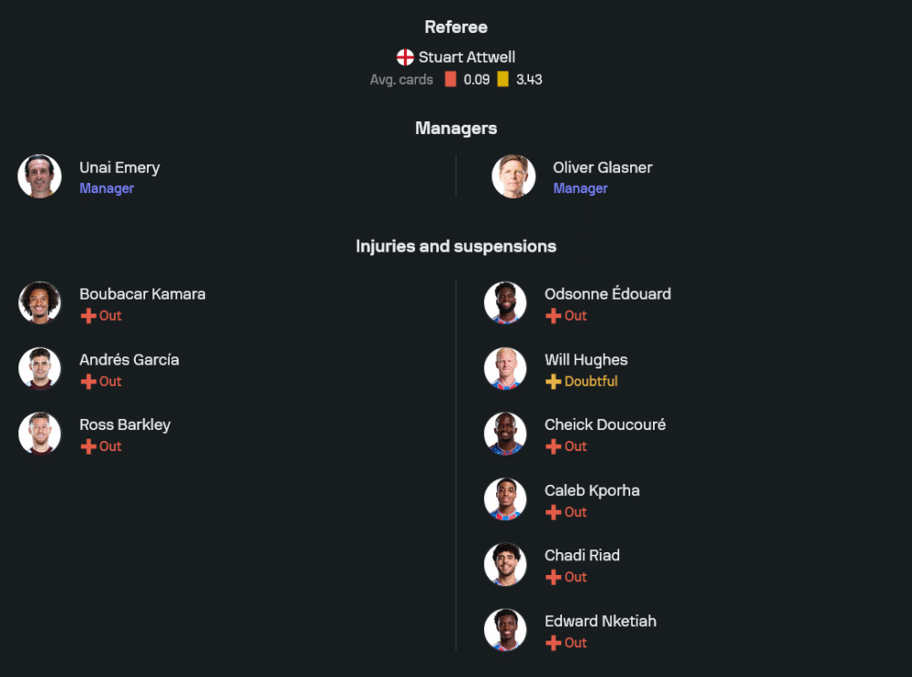 จากข้อมูลตัวผู้เล่นในภาพประกอบ แนวรับพาเลซชุด เกอี–ลาครัวซ์–มิตเชลล์ เล่นกันแน่นและชนะลูกกลางอากาศได้ดี เมื่อต้องรับมือวัตกิ้นส์ที่ชอบวิ่งหลุดไลน์ พาเลซมีคนไล่บี้และดักทางได้ครบ ขณะที่ฝั่งเจ้าบ้าน การไม่มี กามาร่า ทำให้แดนกลางขาดคนตัดเกมธรรมชาติ ช่วงเปลี่ยนจากรุกเป็นรับจึงเสี่ยงโดนแทงสปีดสวน ความชัดอีกอย่างคือผู้ตัดสิน แอ็ตต์เวลล์ แจกเหลืองระดับปานกลาง เกมนี้จังหวะปะทะหนักๆ อาจตัดเกมไหลลื่นวิลล่าได้บ้าง ทำให้สกอร์ไม่น่าบานปลาย