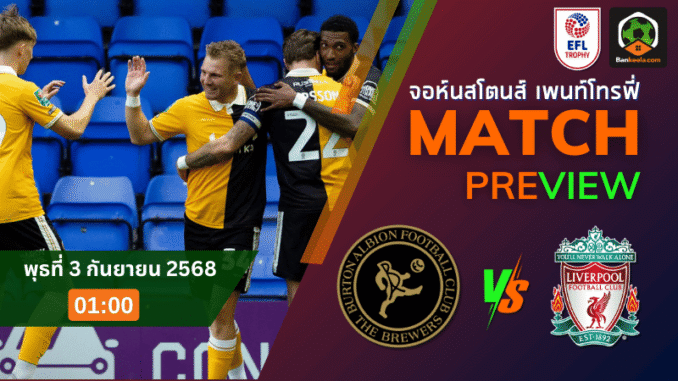 ค่ำคืนวันพุธที่ 3 กันยายน 2568 เวลา 01:00 น. แฟนบอลเตรียมมันส์กับศึก อีเอฟแอล โทรฟี เมื่อ เบอร์ตัน อัลเบี้ยน ทีมอันดับ 18 จากลีกวัน เปิดรัง พิเรลลี่ สเตเดี้ยม ต้อนรับการมาเยือนของ ลิเวอร์พูล ยู-21 ทีมดาวรุ่งจากเมอร์ซีย์ไซด์ แม้เจ้าบ้านจะถูกยกให้เป็นต่อใน ราคาบอลวันนี้ 1 ลูกเต็ม ๆ แต่ด้วยผลงานที่กำลังแกว่ง งานนี้ไม่ง่ายแน่นอน ใครที่ติดตาม ตารางบอลวันนี้ บอกเลยว่าคู่นี้ห้ามพลาด เพราะต่างฝ่ายต่างมีแรงจูงใจสูงที่จะเก็บแต้มในรายการนี้