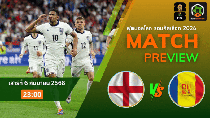 ศึกฟุตบอลโลก 2026 รอบคัดเลือก โซนยุโรป กลุ่ม K ค่ำคืนวันเสาร์ที่ 6 กันยายน 2568 เวลา 23:00 น. แฟนบอลทั่วโลกจับตามองที่สนาม วิลล่า พาร์ค เมื่อ อังกฤษ ของโค้ช โธมัส ทูเคิ่ล เปิดบ้านต้อนรับการมาเยือนของ อันดอร์รา ทีมเล็กแต่ใจใหญ่ เกมนี้บ่อนเปิดราคาบอลล่าสุดให้อังกฤษต่อแรงถึง 3.5 ลูก ชี้ชัดว่าเป็นเกมที่เจ้าบ้านเหนือกว่าทุกกระบวนท่า และนี่คืออีกหนึ่งแมตช์จาก ตารางบอลวันนี้ ที่ไม่ควรพลาดด้วยประการทั้งปวง
