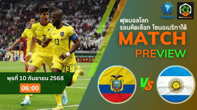 วิเคราะห์บอลฟุตบอลโลก 2026 รอบคัดเลือก โซนอเมริกาใต้ วันพุธที่ 10 กันยายน 2568 เวลา 06.00 น. ที่สนามเอสตาดิโอ โมนูเมนทัล บังโก้ ปิชินช่า เกมใหญ่ระหว่าง เอกวาดอร์ ทีมอันดับ 4 ของตาราง เปิดบ้านต้อนรับ อาร์เจนตินา จ่าฝูงที่ยังคงร้อนแรง ทุกสายตาจับจ้องไปที่แมตช์นี้ซึ่งถูกมองว่าเป็นอีกหนึ่งคู่บิ๊กแมตช์ของคืนวันพุธ เช็กความเคลื่อนไหวได้ใน ตารางบอลวันนี้