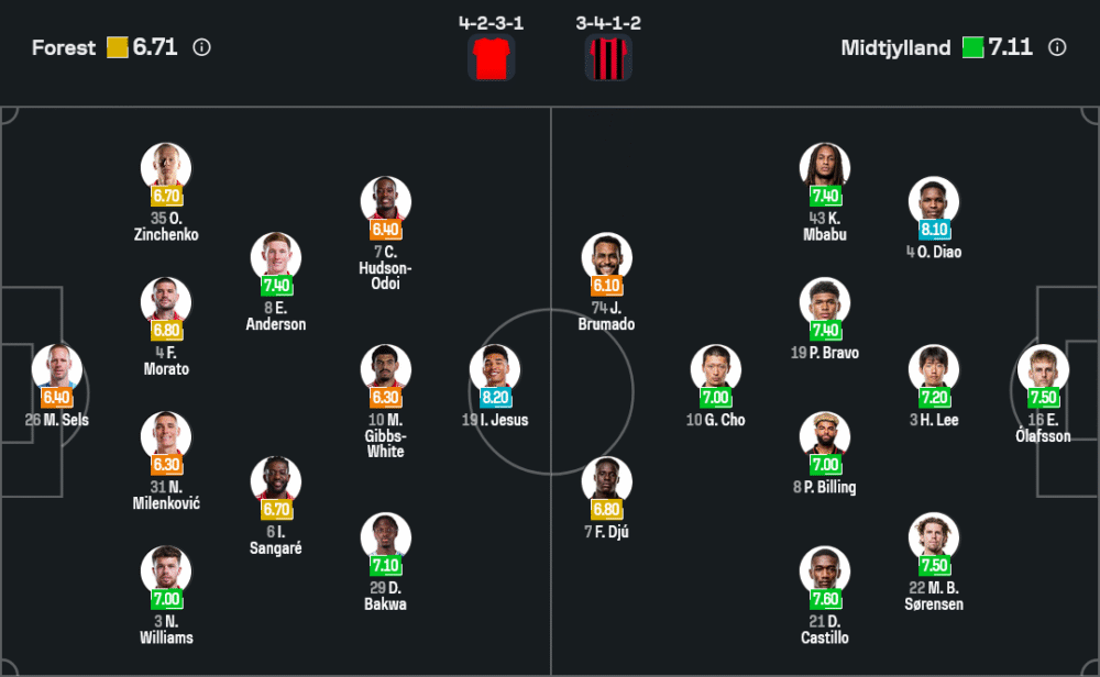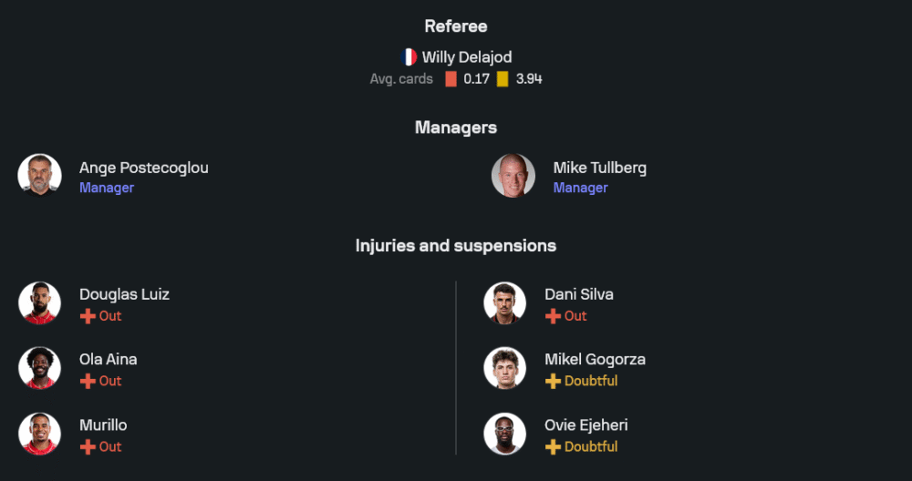 ทีมของ อังเก้ ปอสเตโคกลู พร้อมปรับสปีดเกมรุกให้ดุดันกว่าเดิม จากภาพรวมตัวจริงในหน้าข้อมูลล่าสุด แดนหลังวาง มัตซ์ เซลส์ เฝ้าเสา แบ็กซ้ายใช้ โอเล็กซานเดอร์ ซินเชนโก้ คู่เซ็นเตอร์เป็น โมราโต้ กับ นิโคล่า มิเลนโควิช ขวาเป็น นีโก้ วิลเลียมส์ คู่กลางห้องเครื่อง อิบราฮิม ซ็องกาเร่ ประคองจังหวะร่วมกับ แดน บักวา แถวสองวาง คัลลั่ม ฮัดสัน-โอดอย ทางซ้าย ขวาเติมความเร็วจากดาวรุ่งสปีดจัด ส่วนจอมทัพเป็น มอร์แกน กิ๊บบ์ส-ไวท์ อยู่หลังหน้าเป้า อิกอร์ เฮซุส ที่ความคมเริ่มมา สถานะตัวเจ็บยังมี ดักลาส ลุยซ์, โอล่า ไอน่า และ มูริลโล่ ชวดช่วยงาน ขณะที่ลิสต์ระวังฟิตเนสยังต้องเช็กก่อนคิกออฟ