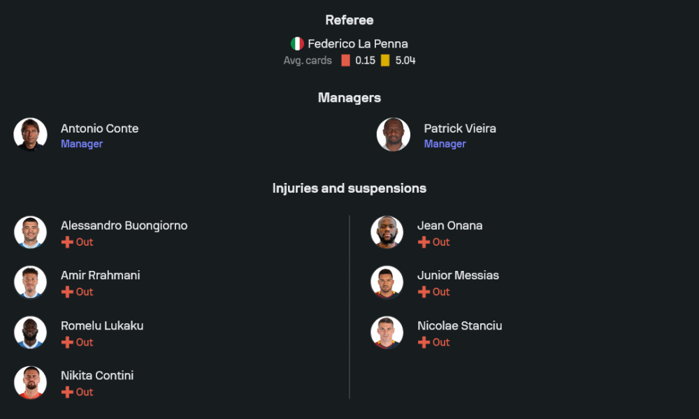 อันโตนิโอ คอนเต้ จัดทัพเจ้าถิ่นด้วยระบบถนัด 4-1-4-1 เน้นวินัยเกมรับและสปีดเปลี่ยนจากรับเป็นรุกแบบฉับพลัน ผู้รักษาประตูใช้ อเล็กซ์ เมเร็ต ยืนคุมด่านสุดท้าย แนวรับเรียงจากขวาไปซ้าย โจวานนี ดิ ลอเรนโซ่ แซม บูเคม่า ฮวน เชซุส และเลโอนาร์โด้ สปินาซโซล่า ห้องเครื่องตัวรับเป็น สตานิสลาฟ โลบ็อตก้า ยืนเดี่ยวหน้ากองหลังเพื่อคุมจังหวะเกม สายครีเอตตรงกลางจัดหนักทั้ง เควิน เดอ บรอยน์ และ สก็อตต์ แม็คโทมิเนย์ คอยขับเครื่องสนับสนุนเกมริมเส้นจาก มัตเตโอ โปลิตาโน่ ส่วนหน้าเป้าหวังพึ่งคมดาบของ ราสมุส ฮอยลุนด์ ที่พร้อมใช้ความเร็วไถทะลวงแนวหลังทีมเยือน ข้อจำกัดคือรายชื่อเดี้ยงยาวอย่าง อเลสซานโดร บวนจอร์โน่ อามีร์ ราห์มานี่ และ โรเมลู ลูกากู ทำให้ตัวเลือกหมุนเวียนในแดนหลังและแดนหน้าบางลงพอสมควร แต่โครงกระดูกหลักยังครบเครื่อง