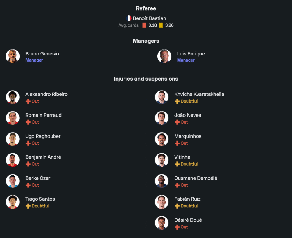 เกมนี้เปแอสเชยังขาดหลายตัวหลัก ทั้ง มาร์กินญอส, ชูเอา เนเวส, อุสมาน เดมเบเล่ และ เดซีเร่ ดูเอ้ ส่วน ฟาเบียน รุยซ์, วิตินญ่า และ ควิชา ควารัตสเคเลีย ต้องรอเช็กความฟิตก่อนเกม