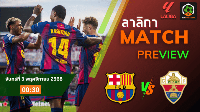 มุมมองเชิง วิเคราะห์บอล เกมนี้จึงน่าจะออกมาเป็นบาร์ซ่าครองเกมบุกต่อเนื่อง เอลเช่สวนกลับได้บางช่วง แต่ยากจะทนแรงกดตลอด 90 นาที หากฟลิคไม่พลาดเรื่องสมาธิช่วงท้าย เกมนี้มีสิทธิ์เห็นสามแต้มแรกในรอบสองสัปดาห์กลับมาสู่เจ้าถิ่น