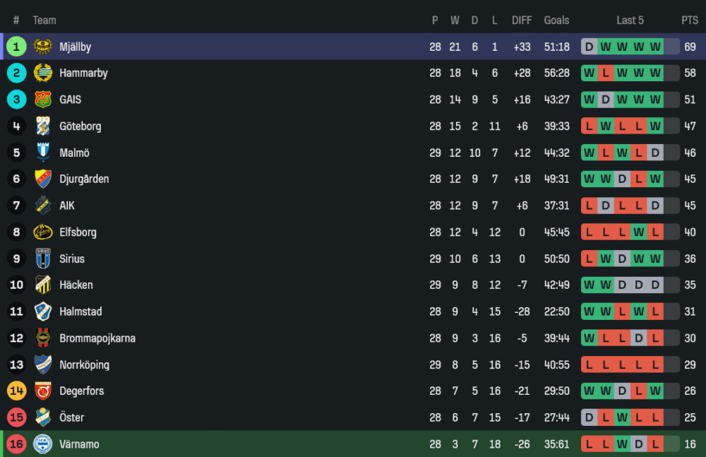 ทีมของ อันเดอร์ส ทอร์สเตนสสัน เดินหน้าด้วยโครง 3-4-3 ที่ลงตัวจนกลายเป็นลายเซ็น จังหวะรุกริมเส้นคืออาวุธหลัก วิงแบ็กฝั่งขวา อิสซ่า คูอองเต้ เติมซ้ำด้านในได้ลุ้นเสมอ ขณะที่ฝั่งซ้ายมี มิคาเอล สตาวิทสกี้ คอยกระชากหาช่องเปิด กองกลางคู่คุมจังหวะเป็น อเล็กซานเดอร์ กุสตาฟส์สัน กับ เลียนเดอร์สสัน ที่หนุนเกมและตัดเกมได้ครบเครื่อง แดนหน้าจัด อูบา ชาร์ลส์ คอยวิ่งไล่กดดันไลน์รับ ร่วมกับ อับดูลาย มานเนห์ ตัวความเร็ว และ ยาค็อบ เบิร์กสตรอม เป็นหอกยืนปักหลักในเขตโทษ ผู้รักษาประตู โจนาส เติร์นควิสต์ คุมหลังบ้านด้วยความนิ่งและเสียงสั่งการที่ชัดเจน ขุมกำลังหลักอยู่กันพร้อมหน้า ไม่มีแข้งติดโทษแบนเพิ่มเติม