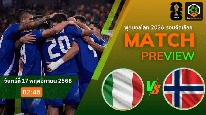 ค่ำคืนวันจันทร์ที่ 17 พฤศจิกายน 2568 สตาดิโอ จูเซ็ปเป้ เมอัซซา จะกลายเป็นสมรภูมิ ฟุตบอลโลก 2026 รอบคัดเลือก โซนยุโรป เดือด เมื่อ อิตาลี ทีมอันดับสองกลุ่ม I เปิดบ้านรับการมาเยือนของ นอร์เวย์ จ่าฝูงที่เดินหน้ากระหน่ำประตูคู่แข่งแบบไม่เกรงใจใคร เกมนี้ไม่ใช่แค่แมตช์ปิดกลุ่มธรรมดา แต่คือศึกชี้ชะตาจ่าฝูงที่อัดแน่นด้วยแรงกดดันทั้งสนาม ใครเปิด ตารางบอลวันนี้ ต้องวงกลมคู่นี้เอาไว้ เพราะสายตาทั้งยุโรปจับจ้องรอดูว่าทัพอัซซูรี่ของ เจนนาโร่ กัตตูโซ่ จะล้างแค้นจากเกมแพ้ยับ 0 3 ในเลกแรกได้หรือไม่ ขณะที่โต๊ะพนันเปิด ราคาบอล ให้เจ้าถิ่นต่อครึ่งลูก บีบให้แฟนบอลต้องคิดกันหนักว่าคืนนี้จะเลือกอยู่ฝั่งไหน