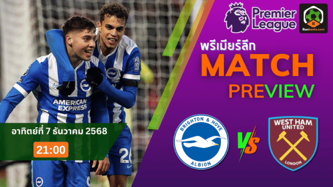 ค่ำวันอาทิตย์ที่ 7 ธันวาคม 2568 เวลา 21.00 น. แฟนบอลอังกฤษต้องไม่หลุดสายตาจากจอ เมื่อศึก พรีเมียร์ลีก คู่ดึกประจำคืนระอุที่เอเม็กซ์ สเตเดี้ยม เจ้าถิ่น ไบรท์ตันฯ อันดับ 7 ของตาราง เปิดบ้านรับมือผู้มาเยือนอย่าง เวสต์แฮม ที่ตอนนี้หล่นไปอยู่โซนท้ายตารางอันดับ 18 สถานการณ์ของทั้งสองทีมต่างกันสุดขั้ว เจ้าบ้านต้องการสามแต้มเพื่อเบียดขึ้นไล่กลุ่มหัวแถว ส่วนขุนค้อนจำเป็นต้องมีแต้มติดมือเพื่อพ้นอับเฉาในโซนตกชั้น
