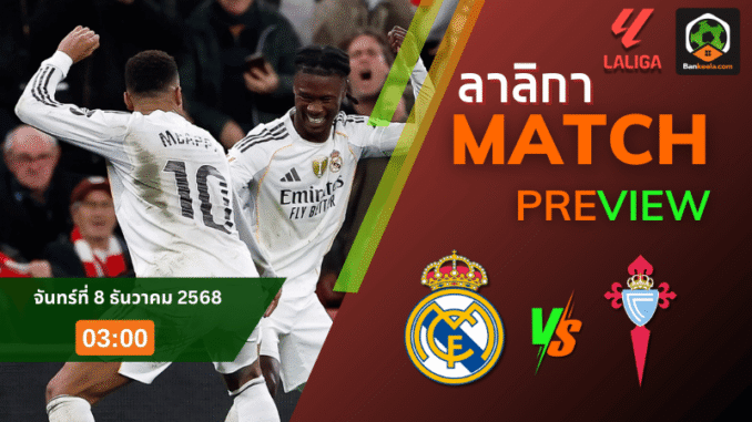 คืนวันจันทร์ที่ 8 ธันวาคม 2568 เวลา 03.00 น. สนามเหย้าของ “ราชันชุดขาว” จะลุกเป็นไฟเมื่อ เรอัล มาดริด เปิดรังรับการมาเยือนของ เซลต้า บีโก้ ในศึก ลาลีกา สเปน เกมนี้มีความหมายทั้งเรื่องศักดิ์ศรีและอันดับบนตาราง เพราะเจ้าบ้านกำลังล่าจ่าฝูง ไล่บาร์เซโลนาอยู่เพียงคะแนนเดียว ส่วนทีมเยือนยืนกลางตารางแต่ยังต้องการแต้มเพื่อหนีโซนล่างและต่อยอดความมั่นใจ การเจอกันถูกจับตามองอย่างหนักในหน้า ตารางบอลวันนี้ เพราะเป็นอีกหนึ่งคู่ที่แนวรุกจัดเต็มกันทั้งสองฝั่ง ราคาหน้าเสื่อเปิดให้ราชันเป็นต่อค่อนข้างชัด จากคุณภาพขุมกำลังและฟอร์มในบ้านที่ดุดัน ยิงกระจายแทบทุกนัดที่เล่นต่อหน้าแฟนบอลตัวเอง