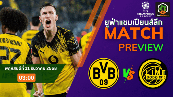 คืนวันพฤหัสบดีที่ 11 ธันวาคม 2568 เวลา 03.00 น. แฟนบอลสายหลอนแสงไฟได้เวลานั่งเฝ้าหน้าจอ เมื่อเวที ยูฟ่าแชมเปียนส์ลีก รอบลีก สเตจ ระเบิดศึกที่ซิกนัล อิดูน่า พาร์ค ระหว่างเจ้าถิ่น โบรุสเซีย ดอร์ทมุนด์ ตัวแทนจากเยอรมัน ที่กำลังมั่นใจสุดขีด เปิดบ้านรับมือ โบโด กลิมท์ ทีมแกร่งจากนอร์เวย์ เกมนี้ไม่ใช่แค่เรื่องของศักดิ์ศรี แต่ยังเป็นแมตช์สำคัญต่อการลุ้นเข้ารอบลึกๆ ของเสือเหลืองด้วย