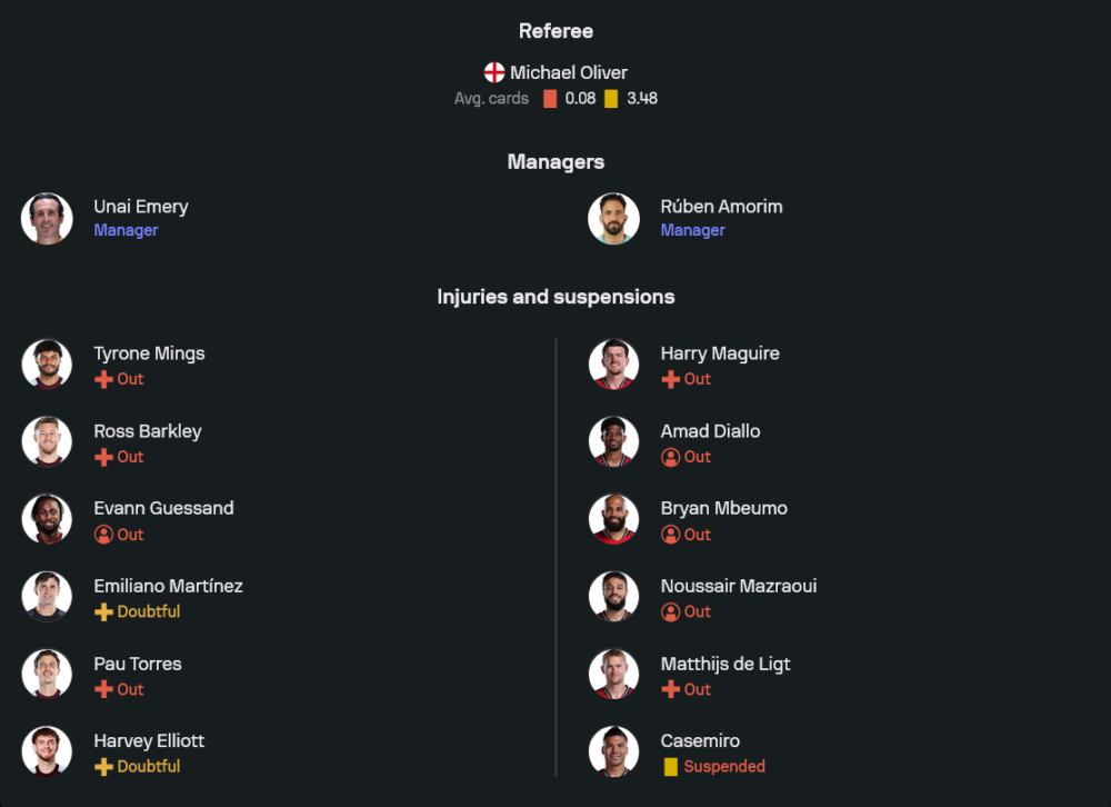 ลูกทีมของ อูไน เอเมรี่ กำลังมั่นใจสุดขีดจากผลงานชนะต่อเนื่องทั้งในลีกและถ้วยยุโรป แต่ยังต้องเจอปัญหาตัวหลักเดี้ยงเหมือนเดิม แผงหลังไร้ชื่อ ไทโรน มิงส์ และ ปาอู ตอร์เรส ที่เจ็บยาว ขณะที่ รอสส์ บาร์คลี่ย์ ก็ยังไม่พร้อมคืนสนาม จากข้อมูลในภาพยังมีชื่อ อีแวนน์ เกสซ็องด์ ที่หายหน้าไป รวมถึง ฮาร์วีย์ เอลเลียตต์ กับ เอมิเลียโน่ มาร์ติเนซ ที่ถูกจัดอยู่ในกลุ่มต้องเช็กฟิต อย่างไรก็ดี เชื่อว่าเอเมรี่จะยังจัด 4-2-3-1 ชุดแกร่งลงสู้ เริ่มจาก มาร์ติเนซ ยืนเฝ้าเสา แผงหลังเป็น แม็ตตี้ แคช, เอซรี่ คอนซ่า, วิกตอร์ ลินเดอเลิฟ และ เอียน มัตเซ่น กลางรับใช้ บูบาก้าร์ กามาร่า คู่กับ อมาดู โอนาน่า สามประสานตัวรุกประกอบด้วย จอห์น แม็กกินน์, ยูรี่ ตีเลอม็องส์ และ มอร์แกน โรเจอร์ส ปั้นเกมอยู่ด้านหลัง โอลลี่ วัตกิ้นส์ หัวหอกเบอร์หนึ่งที่คอยกดดันแนวรับทีมเยือนไม่ให้ได้หายใจ