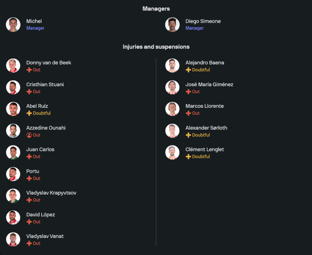 ด้านทีมเยือนภายใต้การนำของ ดิเอโก้ ซิเมโอเน่ ยังคงมาในสไตล์บอลแน่น เน้นระเบียบวินัยทั้งทีม ระบบที่คาดว่าจะใช้คือ 4-4-2 ตามถนัด จากข้อมูลในรูปประกอบจะเห็นว่ามีรายชื่อบาดเจ็บอย่าง โชเซ่ มาเรีย กิเมเนซ และ มาร์กอส ญอเรนเต้ อยู่ในลิสต์ รวมไปถึง เกลม็องต์ เลงเลต์, อเลฮานโดร บาเอน่า และ อเล็กซานเดอร์ ซอร์ล็อธ ที่ต้องเช็คความฟิต แต่โดยรวมแล้วโครงหลักยังอยู่กันพร้อมหน้า