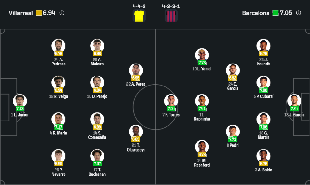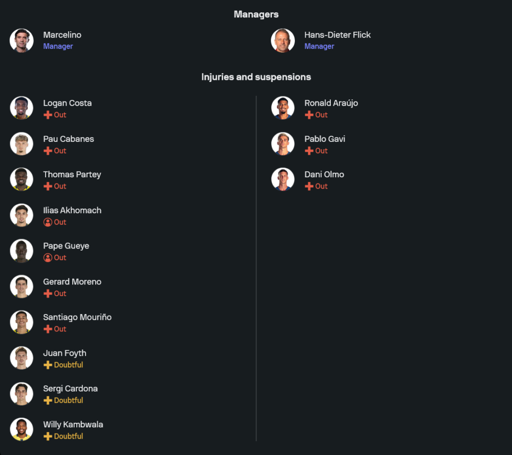 ฝั่งทีมเยือนของกุนซือฮันส์ ดีเทอร์ ฟลิค ก็มีปัญหาขุมกำลังไม่น้อย ดานี่ โอลโม่ กับกาบี มิดฟิลด์ตัวความคิดเจ็บยาว ขณะที่โรนัลด์ อเราโฆ่ เซ็นเตอร์คนสำคัญก็ไม่มีชื่อด้วยเหตุผลส่วนตัว อย่างไรก็ดี ขุมกำลังที่เหลือยังอัดแน่นไปด้วยสตาร์ พร้อมลุยในระบบ 4-2-3-1 โจน การ์เซีย ยืนเป็นด่านสุดท้าย แผงรับสี่คนใช้ฌูลส์ คุนเด้ เล่นแบ็กขวา คู่เซ็นเตอร์เป็นเปา คูบาร์ซี่ จับคู่เคราร์ด มาร์ติน และให้อเลฆานโดร บัลเด้ ประจำการทางซ้าย แดนกลางคู่รับบทสำคัญคือเฟรงกี้ เดอ ยอง ที่คอยคุมจังหวะเกมร่วมกับเอริค การ์เซีย ด้านบนสามตัวรุกเรียงจากขวาไปซ้าย ลามีน ยามาล, ราฟินญ่า และมาร์คัส แรชฟอร์ด คอยปั้นโอกาสให้เฟร์ราน ตอร์เรส ที่จะยืนหัวหอกตัวเป้าในคืนนี้