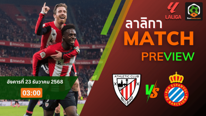 ลาลิกา คืนวันอังคารที่ 23 ธันวาคม 2568 เวลา 03.00 น. สนามซาน มาเมสเตรียมลุกเป็นไฟ เมื่อเจ้าถิ่นอย่าง แอธเลติก บิลเบา ทีมอันดับ 8 ของตาราง เปิดบ้านต้อนรับการบุกมาเยือนของทีมฟอร์มแรงอย่าง เอสปันญ่อล ที่กำลังไต่อันดับขึ้นมาถึงที่ 5 เกมนี้ไม่ใช่แค่สามแต้มธรรมดา แต่คือศึกวัดสภาพจิตใจว่าทีมไหนพร้อมเดินหน้าลุ้นพื้นที่ยุโรปต่อไปในช่วงโค้งสุดท้ายของครึ่งซีซันแรก