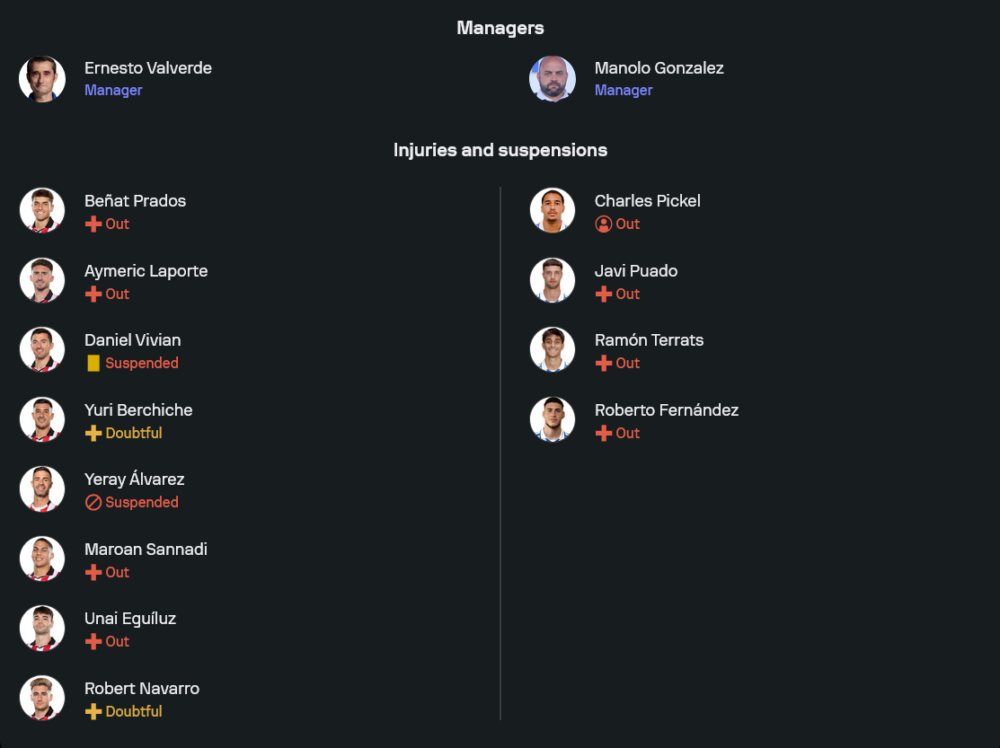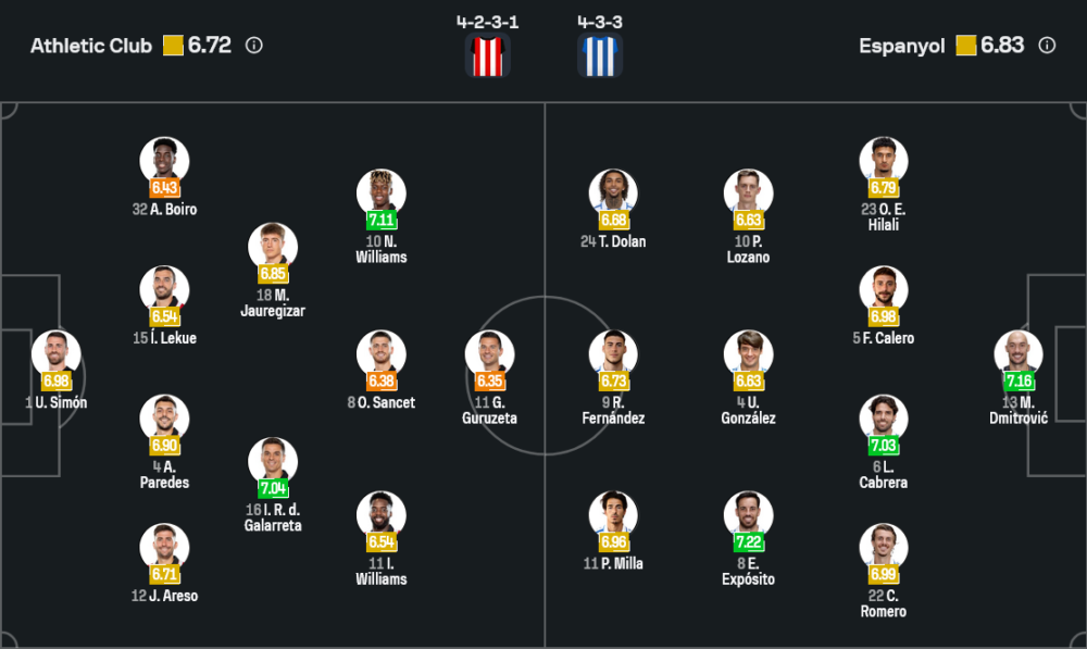 จากภาพไลน์อัพล่าสุดในระบบ 4-2-3-1 ของเจ้าถิ่นและ 4-3-3 ของทีมเยือน บิลเบาวาง กอร์ก้า กูรูเซต้า ยืนหอกเป้า พร้อมแนวรุกรุ่นจี๊ด นิโก้ วิลเลียมส์ กับ อเล็กซ์ โบอิโร่ คอยกดดันแนวรับฝั่งขวาของเอสปันญ่อล ขณะที่ทีมเยือนจัดสามแนวรุกอย่าง ไทรีส โดแลน, ปอล โลซาโน่ และ เอล ฮิลาล ลงล่าตาข่าย โดยมี มาร์โก้ ดมิโตรวิช เฝ้าเสาคอยเป็นกำแพงด่านสุดท้าย