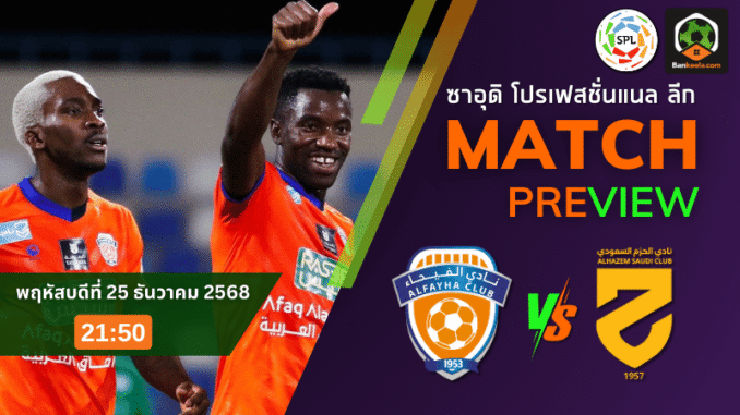 ศึก ซาอุดิ โปรเฟสชั่นแนล ลีก คืนวันพฤหัสบดีที่ 25 ธันวาคม 2568 เวลา 21.50 น. ตามเวลาไทย แฟนบอลจะได้ลุ้นเกมมันส์ตั้งแต่หัวค่ำเมื่อ อัล-ไฟฮา เปิดบ้านที่สนาม King Salman Sport City Stadium รับการมาเยือนของ อัล ฮาเซม เกมนี้ไม่ใช่แค่สามแต้มธรรมดา แต่คือการชิงพื้นที่กลางตารางระหว่างทีมอันดับ 10 กับอันดับ 12 ที่ห่างกันเพียงสองคะแนน บ้านกีฬาเช็กจากโปรแกรมใน ตารางบอลวันนี้ แล้วบอกได้คำเดียวว่า คู่เปิดหัวคริสต์มาสเดย์แบบนี้ บรรยากาศต้องร้อนตั้งแต่เป่านกหวีดแรกแน่นอน