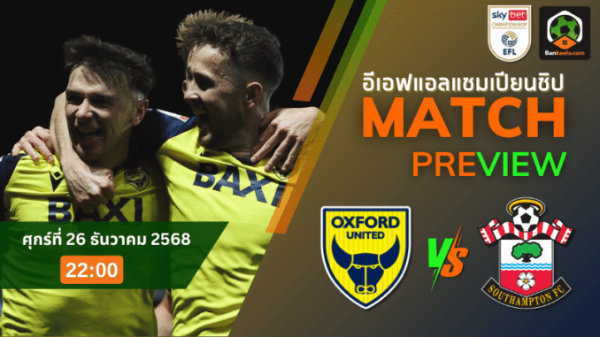 คืนวันศุกร์ที่ 26 ธันวาคม 2568 เวลา 22.00 น. แฟนบอลอังกฤษเตรียมลุยได้เลย เมื่อ อ็อกซ์ฟอร์ด ยูไนเต็ด ทีมบ๊วยโซนแดงกำลังหายใจรวยริน เปิดกัสซัม สเตเดี้ยมรับมือ เซาแธมป์ตัน ที่กำลังหวนกลับมาล่าตั๋วเพลย์ออฟบนเวที อีเอฟแอลแชมเปียนชิป เกมนี้มีเดิมพันทั้งเรื่องศักดิ์ศรี เรื่องแต้ม และอนาคตของฤดูกาลเดียวกันใน 90 นาทีเดียว