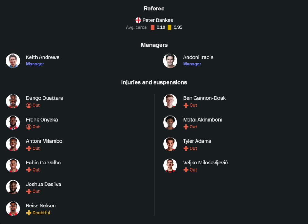 ลูกทีมของ คีธ แอนดรูว์ส มีทั้งข่าวดีและข่าวร้ายปะปนกันไป ด้านลบคือยังหมดสิทธิ์ใช้งานกลุ่มผู้เล่นตัวรุกอย่าง ดังโก้ อูอัตตาร่า, ฟร้องค์ อองเยก้า, ฟาบิโอ คาร์วัลโญ่, จอช ดาซิลวา และ อันโตนี่ มิลัมโบ ที่กอดคอกันเจ็บยกแพ็ค รวมถึง ไรส์ เนลสัน ที่ยังต้องรอเช็กอาการ ขณะที่นักเตะสัญชาติแอฟริกันบางรายติดภารกิจทีมชาติอีกต่างหาก ทำให้ตัวเลือกในแนวรุกไม่หนาแน่นเท่าที่ควร