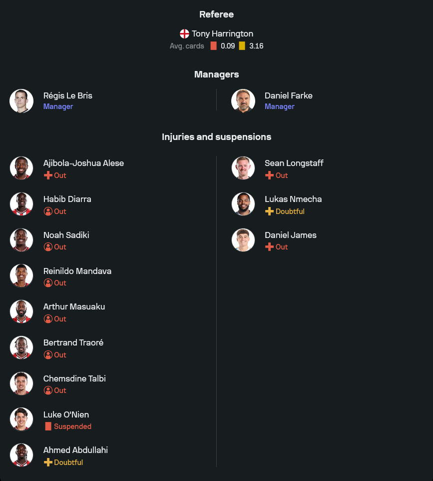 ฝั่งทีมเยือน ดาเนี่ยล ฟาร์เค ถือว่าได้เปรียบเรื่องตัวผู้เล่นมากกว่า มีแค่ ฌอน ลองสตาฟฟ์ กับ แดเนี่ยล เจมส์ ที่ยังเจ็บอยู่ รวมถึง ลูคัส เมช่า ที่ต้องลุ้นความฟิตอีกครั้ง แต่โดยภาพรวมแล้วโครงสร้างหลักยังมาเกือบครบ ฟาร์เค เลือกใช้ระบบ 3-5-2 เพื่อเน้นความแน่นในแดนกลางและการเปลี่ยนรับเป็นรุกที่รวดเร็ว