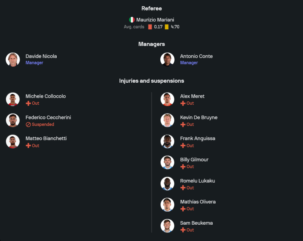 ทีมเยือนจากเมืองเนเปิลส์ของ อันโตนิโอ คอนเต้ เดินทางมาพร้อมความมั่นใจจากการกวาดแชมป์ซูเปอร์คัพอิตาลี แต่สภาพทีมยังมีปัญหาตัวหลักหลุดหายไม่น้อย ไล่ตั้งแต่ผู้รักษาประตู อเล็กซ์ เมเร็ต ที่ยังเดี้ยง ต่อด้วยสามกองกลางตัวเก่ง เควิน เดอ บรอยน์ ฟร้องค์ อองกิสซ่า และ บิลลี่ กิลมัวร์ ที่ยังต้องพักรักษาตัว ขณะที่แนวรับอย่าง แซม บูเคม่า กับ มาธิอัส โอลิเบร่า ก็มีปัญหาอาการเจ็บเพิ่มเติม ส่วน โรเมลู ลูกากู ยังต้องเรียกความฟิตแม้จะกลับมามีชื่อในทีมแล้ว คอนเต้เตรียมสู้ศึกด้วยระบบ 3 4 2 1 ใช้ วานย่า มิลินโควิช ซาวิช ยืนเฝ้าเสา แนวรับสามคนประกอบด้วย โจวานนี่ ดิ ลอเรนโซ่ อามีร์ ราห์มานี่ และ ฮวน เฮซุส แดนกลางสี่คนมี เลโอนาร์โด สปินาซโซล่า ทางซ้าย สตานิสลาฟ โลบอตก้า กับ สก็อตต์ แม็คโทมิเนย์ คุมเกมกลางสนาม และ เอลิฟ เอลมาส ทางขวา ส่วนสองตัวรุกด้านหลังหอกใช้ ดาวิด เนเรส ประสานกับ มัตเตโอ โปลิตาโน่ ปั้นเกมสนับสนุน ราสมุส ฮอยลุนด์ ค้ำหอกตัวเป้า