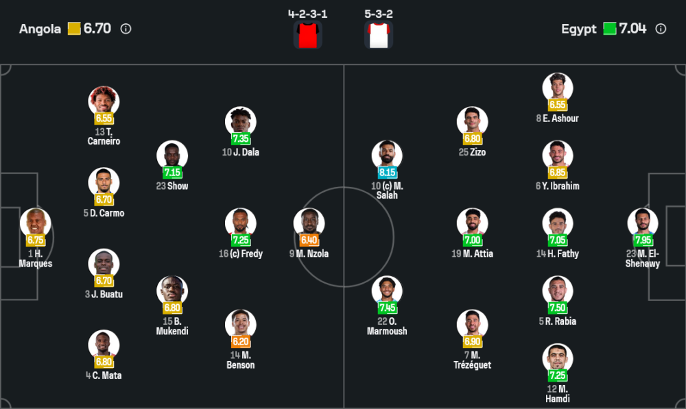แองโกล่าของกุนซือ Patrice Beaumelle ยังคงยึดแผน 4-2-3-1 เป็นหลัก ผู้รักษาประตูใช้ ฮูโก้ มาร์เกส เฝ้าเสาต่อเนื่องหลังโชว์ฟอร์มเซฟสำคัญหลายจังหวะในสองนัดแรก แนวรับสี่คนประกอบด้วย มาตา, บูอาตู, ดาร์โม และ ติอาโก้ คาร์เนย์โร่ คอยปักหลักดวลกับเกมรุกสุดโหดของอียิปต์