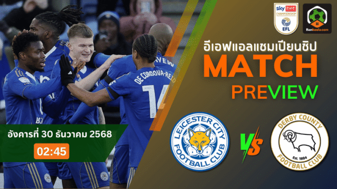 คืนวันอังคารที่ 30 ธันวาคม 2568 เวลา 02.45 น. แฟนบอลอังกฤษเตรียมเปิดจอรอชมศึกสุดเดือดในเวที แชมเปียนชิพ เมื่อ เลสเตอร์ ซิตี้ เปิดรังต้อนรับการมาเยือนของ ดาร์บี้ เค้าท์ตี้ เกมนี้ไม่ใช่แค่ศักดิ์ศรีทีมดังจากมิดแลนด์ แต่ยังเป็นแมตช์ที่อาจส่งผลต่อภาพรวมบนหน้าเว็บ ตารางบอลวันนี้ และเส้นทางลุ้นเลื่อนชั้นของทั้งสองสโมสรด้วย