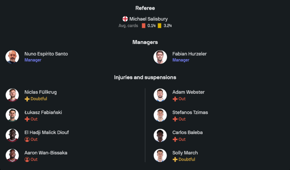 อีกหนึ่งปัจจัยที่ไม่ควรมองข้ามคือผู้ตัดสิน ไมเคิล ซอลส์บิวรี ที่มีค่าเฉลี่ยแจกใบเหลืองราวสามใบต่อเกม และใบแดงในอัตราไม่สูงมาก ทำให้ทั้งสองทีมอาจกล้าเล่นปะทะหนักในช่วงกลางสนาม เกมนี้รูปเกมมีโอกาสอึดอัดในครึ่งแรก ก่อนจะเปิดแลกมากขึ้นเมื่อเข้าสู่ครึ่งหลัง ซึ่งสอดคล้องกับเรตจากสำนักต่างประเทศที่ให้ทรรศนะแนวครึ่งแรกมีโอกาสเสมอและทีมเยือนเบียดชนะในช่วงท้าย บ้านกีฬาเลยมองว่าแนวทางการอ่านเกมและการจัดลำดับ วิเคราะห์บอล ของคู่นี้ต้องเน้นไปที่ความคมในพื้นที่สุดท้ายของไบรท์ตันและความผิดพลาดในเกมรับของเวสต์แฮมเป็นหลัก