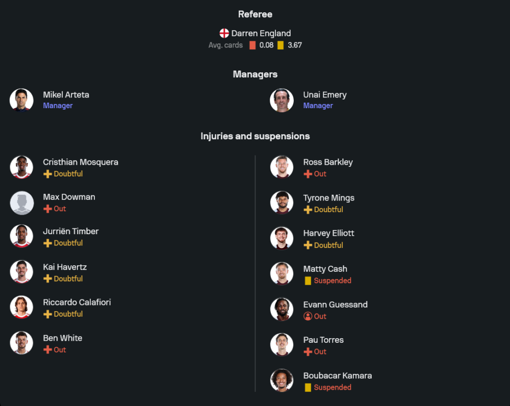 ปัญหาหลักอยู่ที่โทษแบนของ แม็ตตี้ แคช แบ็กขวาตัวหลัก และ บูบาการ์ กามาร่า ห้องเครื่องสำคัญ รวมถึงอาการเจ็บของ ไทโรน มิงส์, ปาอู ตอร์เรส และ รอสส์ บาร์คลี่ย์ ขณะที่ อีแวนน์ เกาส์ซ็องด์ ต้องไปรับใช้ชาติ แต่เอเมรี่ยังมีตัวแทนให้ใช้งานได้ ลาแมร์ โบการ์ด พร้อมยืนเป็นฟูลแบ็กฝั่งซ้ายหรือขวาตามแท็กติก ขณะที่คู่เซ็นเตอร์ใช้ เอซรี่ คอนซ่า จับคู่ วิกตอร์ ลินเดเลิฟ มี เอียน มัตเซ่น ยืนฟูลแบ็กอีกฝั่ง ผู้รักษาประตูยังคงเป็น เอมิเลียโน่ มาร์ติเนซ ที่ยืนระยะหนึบมาตลอดฤดูกาล