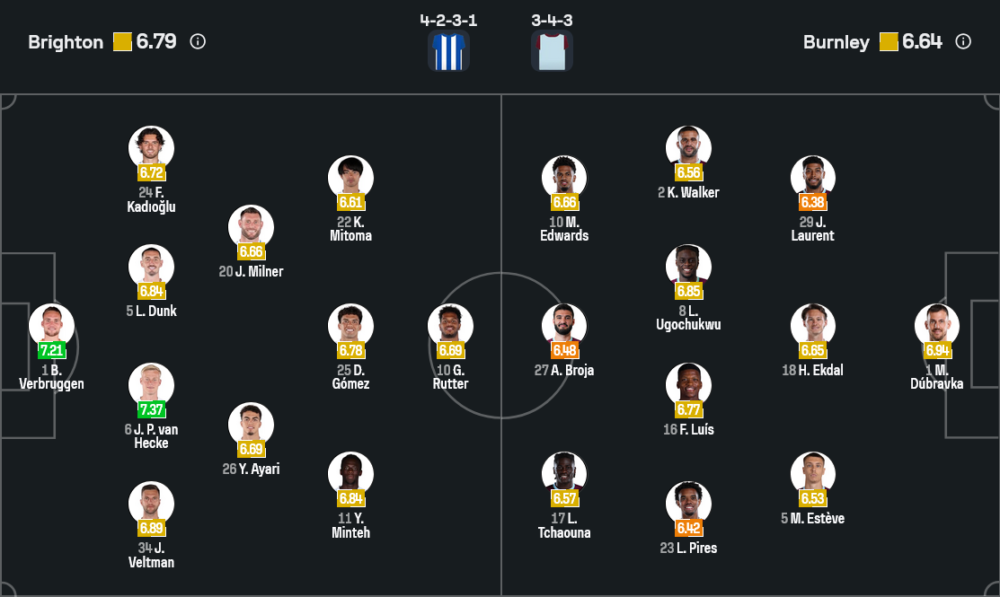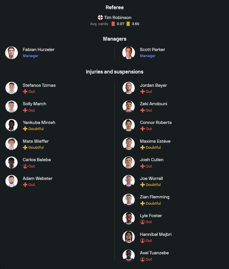 ไบรท์ตันภายใต้การคุมทีมของ ฟาเบียน ฮูร์เซเลอร์ กำลังเจอปัญหาขุมกำลังไม่สมบูรณ์แบบเต็มๆ แดนกลางต้องขาด การ์ลอส บาเลบา ที่ถูกเรียกไปช่วยชาติ ขณะที่ โซลลี่ มาร์ช, สเตฟานอส ซิมาส, ยานกูบา มินเตห์, มัตส์ วีฟเฟอร์ และ อดัม เว็บสเตอร์ ต่างมีชื่ออยู่ในลิสต์เดี้ยงหรือความฟิตไม่เต็มร้อย ทำให้ตัวเลือกโรเตชันน้อยลงพอสมควร อย่างไรก็ตาม ฮูร์เซเลอร์ยังคงยึดระบบ 4-2-3-1 เป็นหลัก โดยมี บาร์ต แฟร์บรูเกน เฝ้าเสา แนวรับสี่คนใช้ โยเอล เฟลต์มัน กับ เฟร์ดี้ คาดิโอกลู ยืนแบ็กสองฝั่ง ขณะที่คู่เซ็นเตอร์เป็น ลูอิส ดังค์ กัปตันคนสำคัญจับคู่กับ ยาน พอล ฟาน เฮ็คเก้ คุมเกมรับหน้ากรอบเขตโทษ