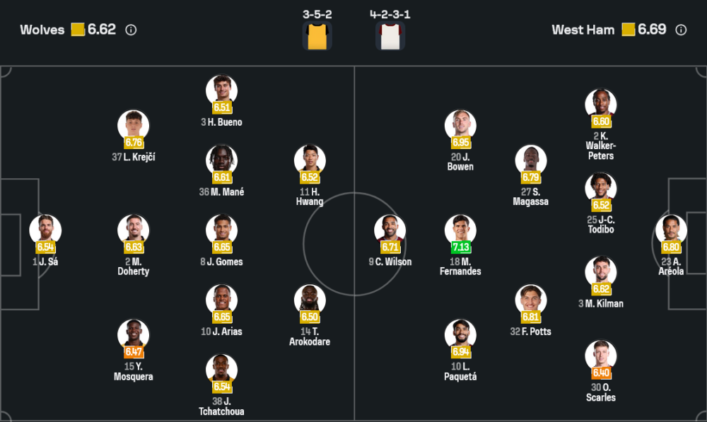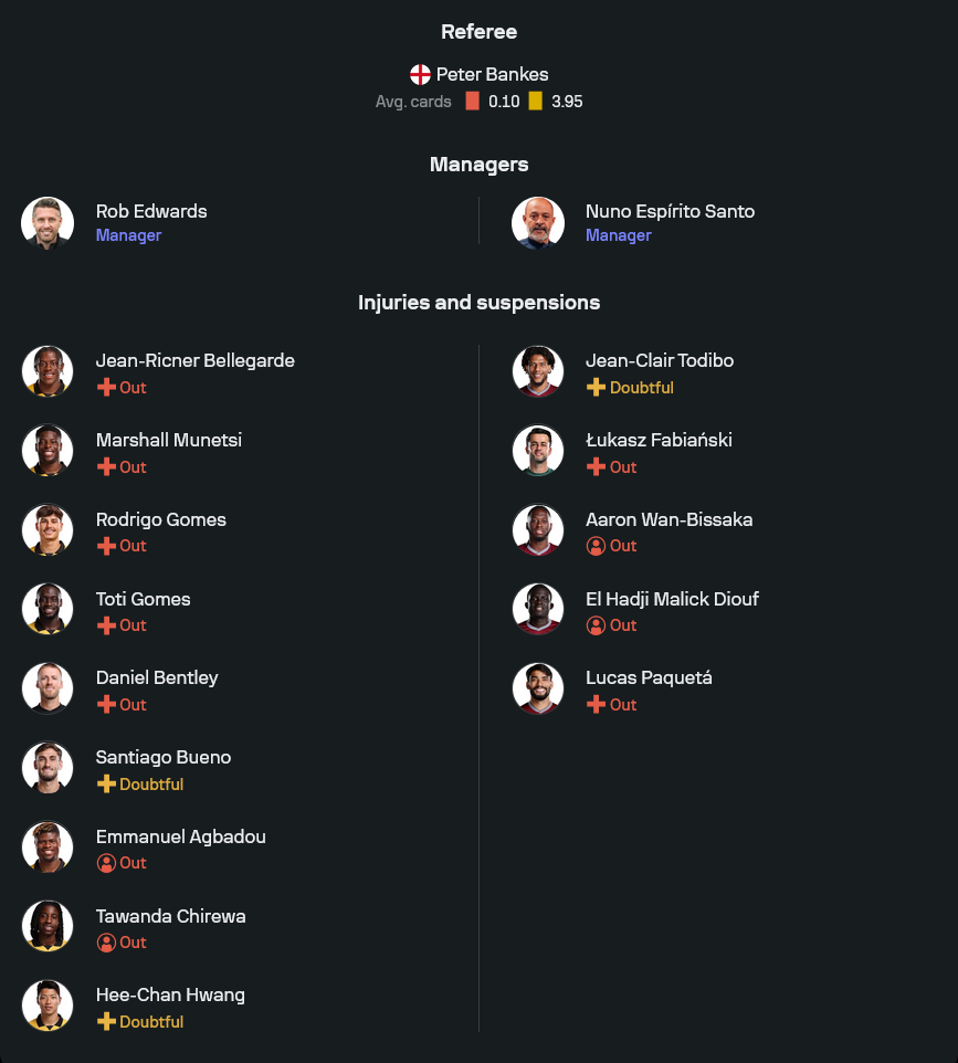 อัลฟอนเซ่ อาเรโอล่า ยึดมือหนึ่งในปากประตู แนวรับสี่คนประกอบด้วย ไคล์ วอล์คเกอร์ ปีเตอร์ส ยืนแบ็กขวา คู่เซ็นเตอร์เป็น คอนสแตนตินอส มาฟโรปานอส จับคู่กับ แม็กซิมิเลี่ยน คิลแมน ส่วนแบ็กซ้ายใช้บริการ โอลิเวอร์ สคาร์เลส กลางรับสองตัววาง ซูนกูตู มากาสซ่า กับ เฟร็ดดี้ พ็อตต์ ช่วยกันตัดเกมแล้วดันบอลขึ้นหน้า โซนเกมรุกให้ จาร์ร็อด โบเว่น ลุยจากฝั่งขวา ลูคัส ปาเกต้า (หากผ่านเช็กฟิต) หรือแนวรุกตัวแทนยืนฝั่งซ้าย โดยมี มาเตอุส แฟร์นานเดส ที่ผลงานโดดเด่นในช่วงหลังยืนเป็นเพลย์เมกเกอร์คอยเชื่อมกับหอกเดี่ยว คัลลั่ม วิลสัน หากสามประสานแนวรุกเข้าฝัก เกมสวนกลับของขุนค้อนมีพิษสงร้ายแรงแน่นอน