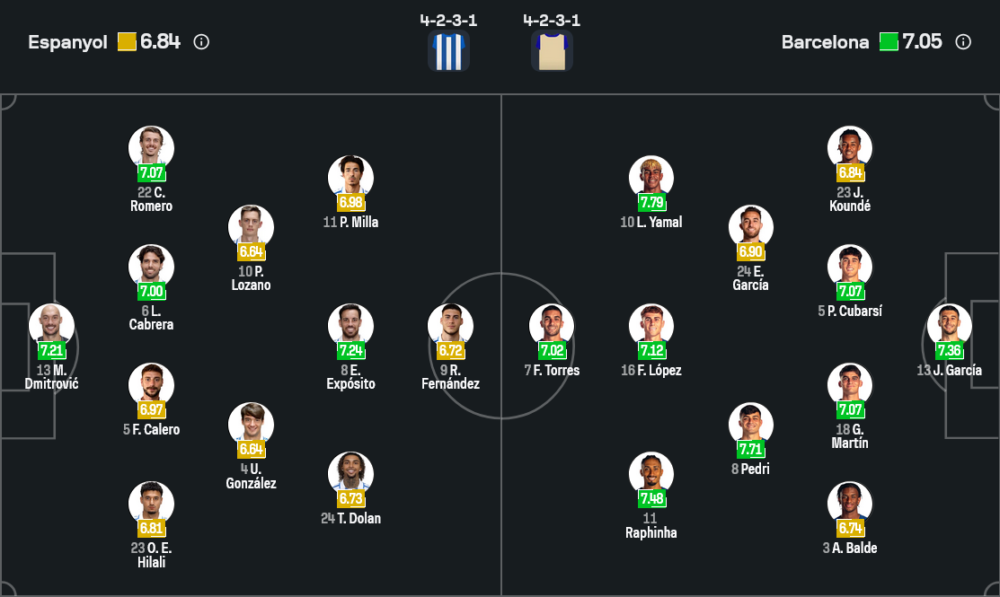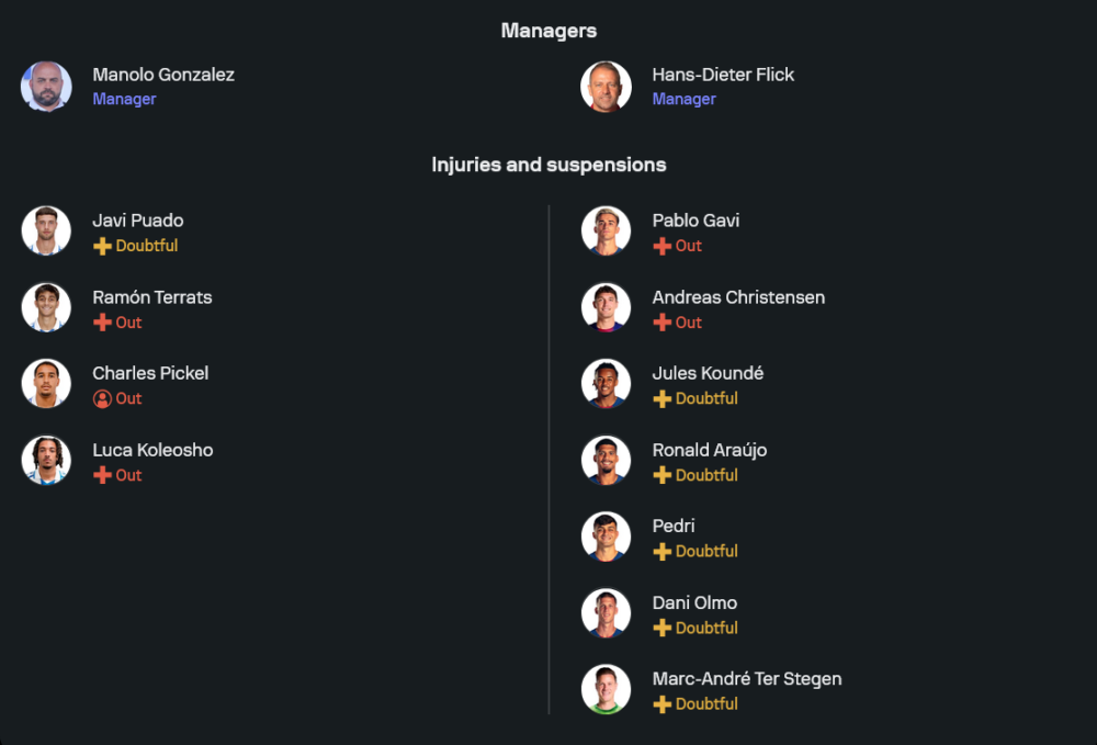 ฝั่งทีมเยือนของ ฮันส์ ดีเตอร์ ฟลิค กำลังอยู่ในช่วงท็อปฟอร์ม ชนะต่อเนื่องทั้งลีกและบอลถ้วย แต่ก็ต้องปวดหัวกับอาการบาดเจ็บของตัวหลักหลายราย ทั้ง ปาโบล กาบี และ อันเดรียส คริสเตนเซ่น ที่หมดสิทธิ์ลงสนามแน่นอน ขณะที่ ฌูลส์ คุนเด้, โรนัลด์ อเราโฮ่, เปดรี, ดานี โอลโม่ รวมถึง มาร์ก อังเดร แทร์ ชเตเก้น ยังถูกจัดอยู่ในกลุ่มต้องเช็กความฟิตก่อนเกม ทำให้โค้ชเยอรมันต้องหมุนเวียนขุมกำลังอย่างระมัดระวัง แผนที่คาดคือ 4-2-3-1 เช่นกัน โจน การ์เซีย ยืนด่านสุดท้าย แนวรับสี่คนประกอบด้วย อเลฆานโดร บัลเด้ ทางซ้าย, ฌูลส์ คุนเด้ ทางขวา พร้อมด้วย เปา คูบาร์ซี่ จับคู่ เอริค การ์เซีย ตรงกลางสนาม คู่กลางใช้ เปดรี (หากพร้อม) ผนึกกำลังกับ กาเบรียล มาร์ติน คุมจังหวะเกมรุกเกมรับ สามตัวรุกด้านหน้าเป็น ราฟินญ่า ทางกราบ, ลามีน ยามาล อีกฝั่ง และ เฟร์มิน โลเปซ ทำหน้าที่เชื่อมเกมหลัง เฟร์ราน ตอร์เรส หรือ โรเบิร์ต เลวานดอฟสกี้ ที่พร้อมยืนหอกตัวเป้าล่าตาข่าย