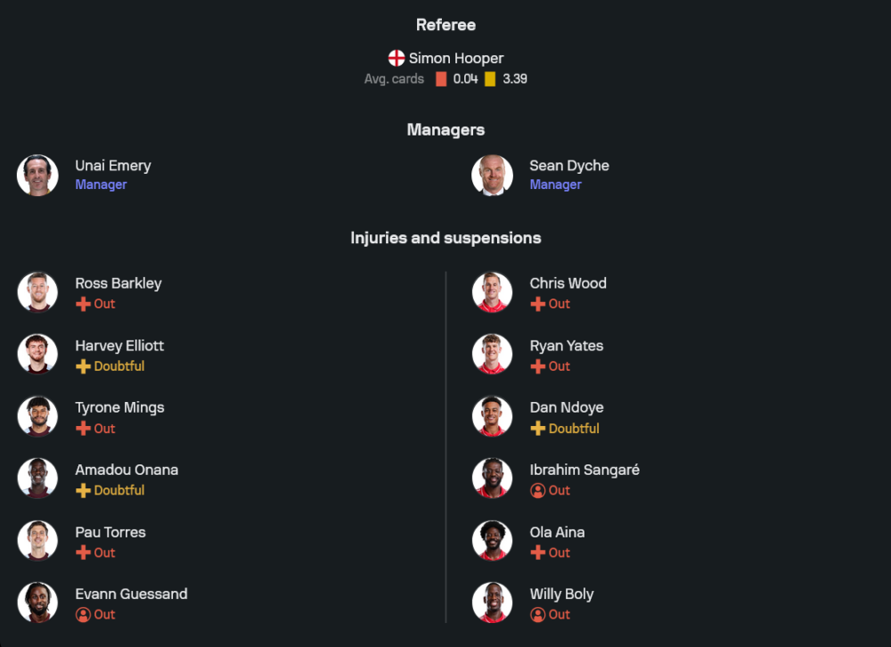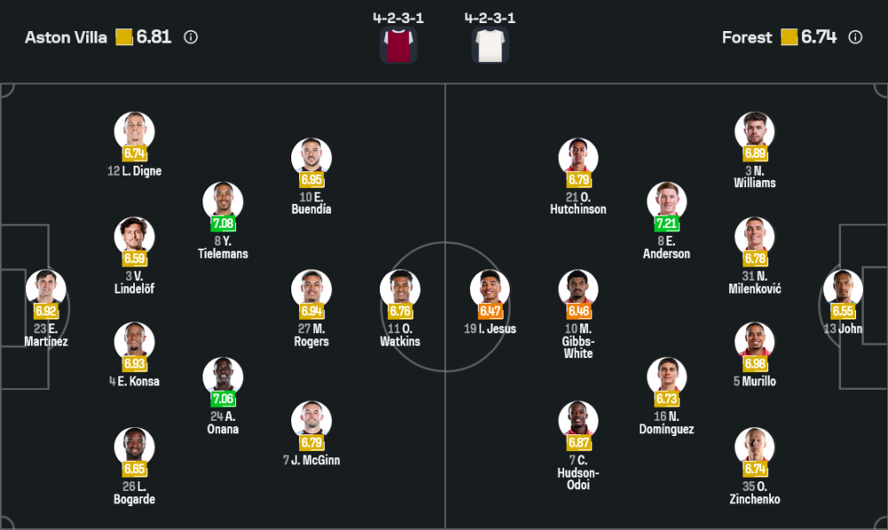 เอเมรี่จัดทัพในระบบ 4-2-3-1 ตามถนัด วาง เอมิเลียโน่ มาร์ติเนซ เฝ้าเสา แผงแบ็กโฟร์ใช้ เลกิ้น บ็อกการ์ด ยืนฝั่งขวา คู่เซ็นเตอร์เป็น เอซรี่ คอนซ่า จับคู่ วิกตอร์ ลินเดอเลิฟ ฝั่งซ้ายเป็น ลูก้าส์ ดีญ เติมเกมรุกจัดจ้าน กลางรับสองคนเป็น อมาดู โอนาน่า กับ จอห์น แม็คกินน์ ช่วยกันตัดเกมและเชื่อมบอลไปข้างหน้า โดยมีสามแนวรุกตัวสร้างสรรค์อย่าง ยูรี่ ตีเลอม็องส์, เอมิเลียโน่ บูเอนเดีย และ มอร์แกน โรเจอร์ส ปั้นเกมอยู่ด้านหลัง โอลลี่ วัตกิ้นส์ ที่พร้อมล่าตาข่ายต่อหน้าแฟนบอลเจ้าถิ่น