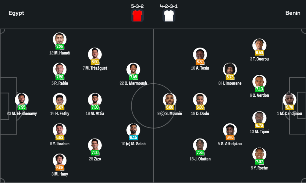 แดนกลางใช้สามมิดฟิลด์สไตล์ขยันอย่าง มาห์มูด อัตเตีย กับ อาเหม็ด “ซิโซ่” ซายิด ที่เชื่อมเกมได้เนียน บวกกับ มาห์มูด เทรเซเก้ต์ ที่พร้อมขยับออกไปช่วยริมเส้นเวลาเปลี่ยนรูปแบบการเล่น ส่วนแดนหน้าจัดเต็ม ซาล่าห์ รับบทกัปตันทีมยืนคู่ มาร์มูช สองคนนี้จากภาพเรตติ้งถือว่าคนละชั้นกับแนวรับเบนิน โดยเฉพาะ ซาล่าห์ ที่ได้คะแนนสูงโดดเด่นในเกมล่าสุด แสดงให้เห็นว่าฟอร์มกำลังร้อนระอุ ข้อเสียเดียวของอียิปต์คือ โมฮานัด ลาชีน อยู่ในสถานะเช็กฟิต แต่ด้วยขุมกำลังที่เหลือ ฮาสซานยังมีตัวเลือกพอให้หมุนเวียนโดยไม่เสียสมดุลทีม