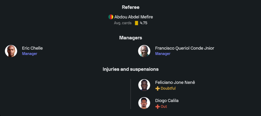 คู่มิดฟิลด์ตัวรับมี เอ็ม.เอ็น. คัมบาลา กับ เค. อับดาลา คอยตัดเกมและไล่บี้กลางสนาม ข้างหน้าถือเป็นหัวใจสำคัญของทีม นำโดยจอมเทคนิคอย่าง โดมิงเกส ที่สวมปลอกแขนกัปตัน ประสานงานกับปีกความเร็วสูง จี. คาตาโม่ และ ฟรานเดลิโน่ ชัมบูโก้ ส่วนหัวหอกตัวเป้าอย่าง อิวานี มีหน้าที่ป่วนแนวรับไนจีเรียตลอด 90 นาที ด้านข่าวร้ายคือ ดิเอโก้ กาลียา ตัวรับสารพัดประโยชน์ยังอยู่ในกลุ่มเจ็บต้องพัก ขณะที่ เฟลิชาโน่ โชน เนเน่ ถูกประเมินอาการบาดเจ็บแบบ “เช็กฟิตก่อนแข่ง” ทำให้ตัวเลือกในเกมรับไม่สมบูรณ์เต็มร้อย